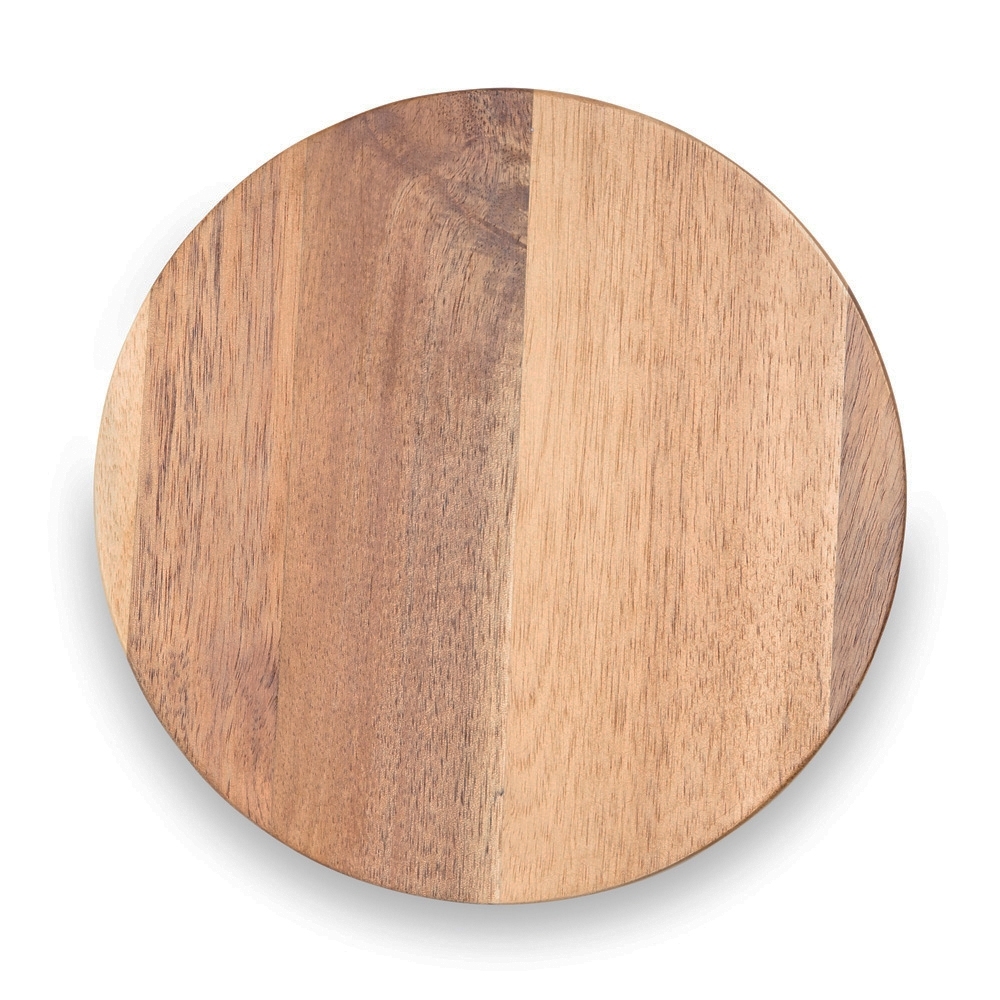 Kit queijo 3 peças em estojo kraft, contém: tábua de madeira redonda, faca com ponta, e faca vazada com ponta. Tábua com orifício para encaixe.