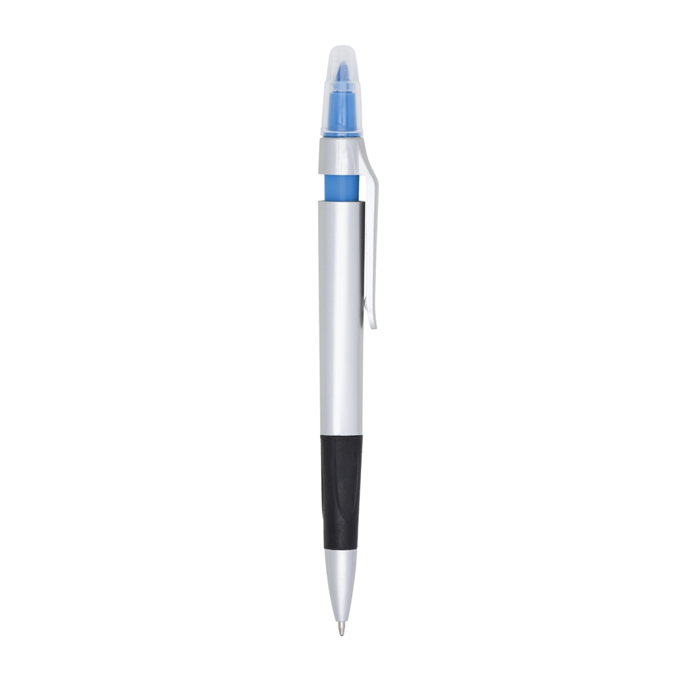 Caneta plástica com marca texto, contém detalhe emborrachado e tampa protetora para o marca texto. Carga esferográfica azul e acionamento por clique.
