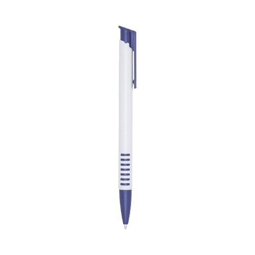 Caneta plástica com carga esferográfica azul e acionamento por clique.