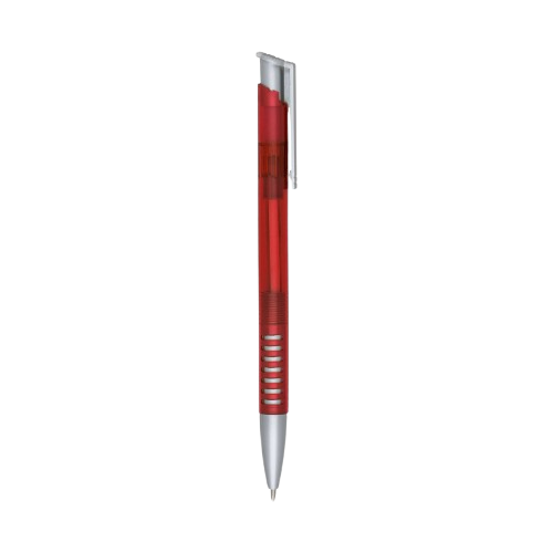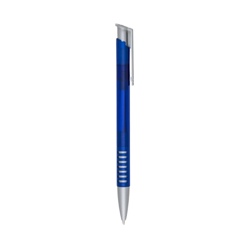 Caneta plástica translúcida com carga esferográfica azul e acionamento por clique.