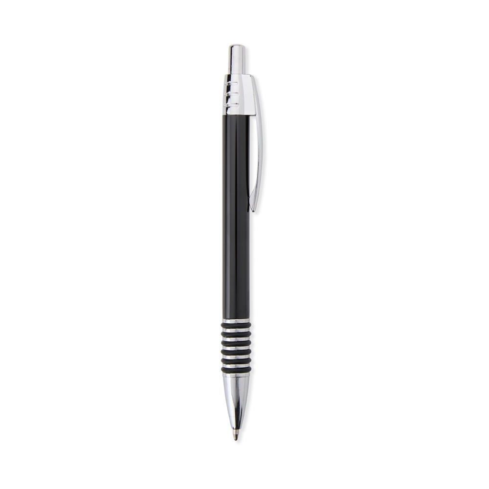Caneta metálica com acabamento brilhante, versões em couro sintético e fibra preta. Carga esferográfica azul e acionamento por rotação.