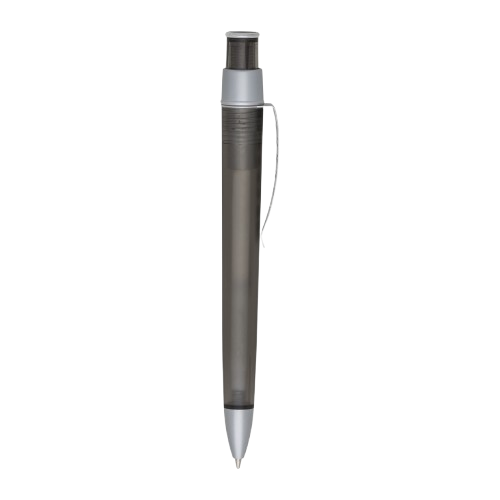 Descrição: Caneta plástica fosca inteira colorida com detalhes prata. Clip de metal com doze furos, aciona por clique.